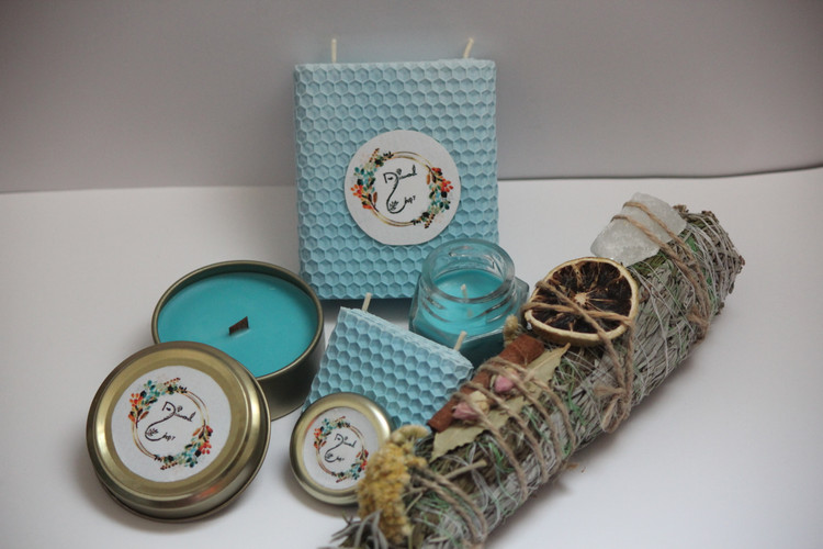 نوع شمع: ترکیبی از شمع های کتابی موم عسل در دو سایز و شمع جار شش ضلعی و شمع قوطی فلزی + یک عدد اسماج
