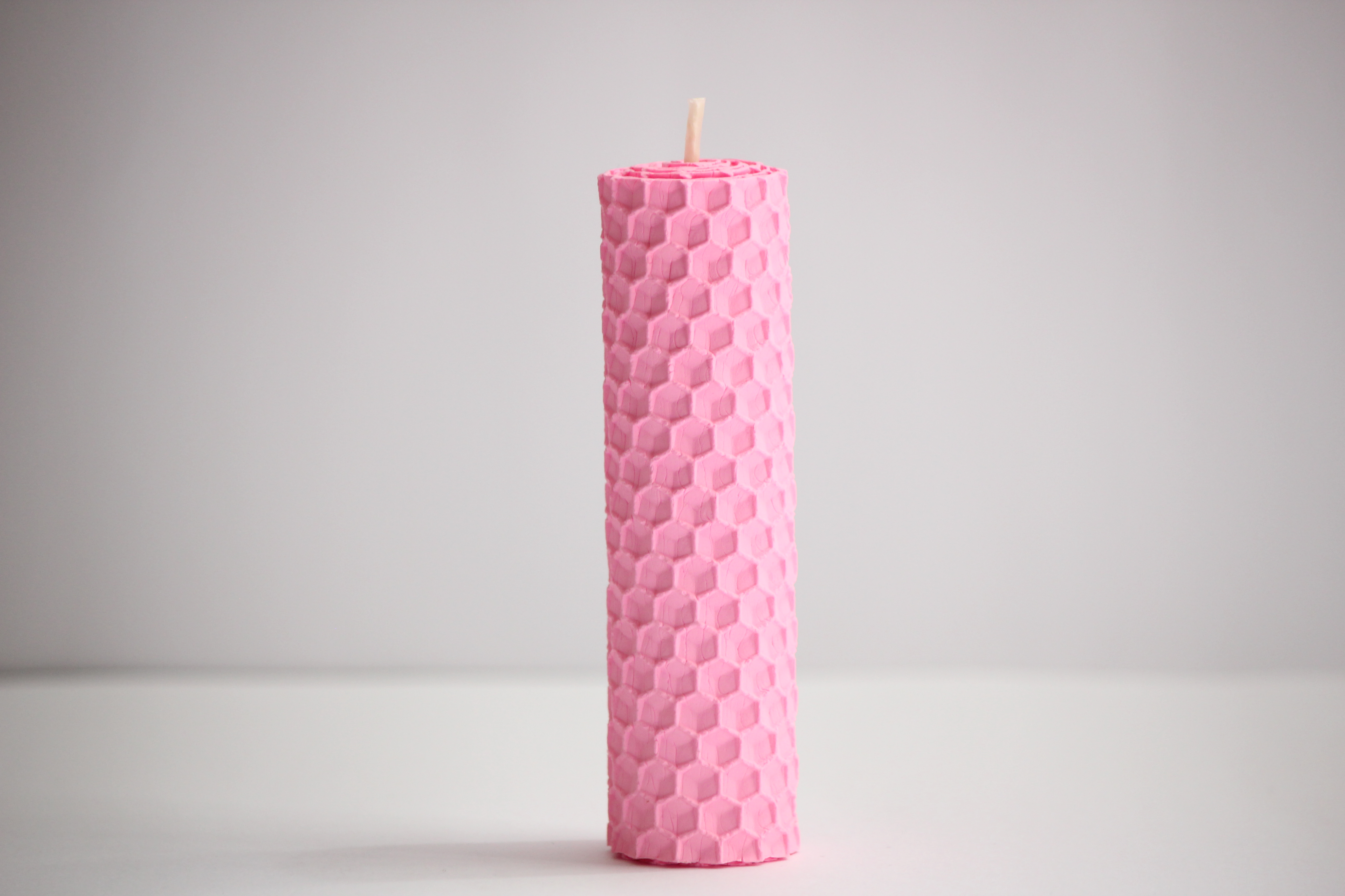 شمع قلمی صورتی با مومعسل طبیعی ساخته شده و رنگ ملایمش حالوهوایی لطیف و دلنشین به فضا میدهد.